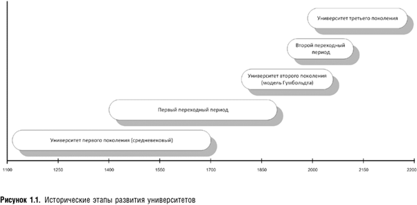 Чтобы понять изменения, отличающие университеты на этих трех временных этапах, необходимо сделать обзор истории развития университетов. Мы различаем три поколения университетов – средневековый университет (первое поколение), гумбольдтская модель (второе поколение) и университет третьего поколения. Становление университетов третьего поколения – пока еще дело будущего. Сегодня университеты находятся на переходном этапе, но наиболее передовые из них уже заметно продвинулись на пути к модели университета третьего поколения. Похожий переходный период, имевший место между эпохами Возрождения и Просвещения, привел к появлению университетов второго поколения (см. рис. 1.1; датировка приблизительна).