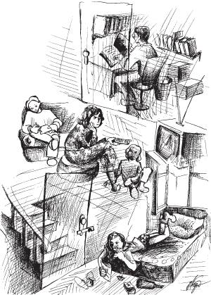 В противоположных концах кабинета Карла стоят два больших кожаных дивана. Возле одного дивана – три кресла, также обитые кожей. Возле другого дивана – вертящееся кресло Карла и его стол, закрывающий угол, а также стул котерапевта. Сидячие места образуют аккуратный прямоугольник. Отец и дочь-подросток сидели рядом в двух креслах, а мать – на одном из диванов. Младшая дочь выбрала кресло-качалку, стоявшую недалеко от матери. Я обратил внимание на особенности их расположения: каждая из дочерей – с одним из родителей, а родители – отдельно.