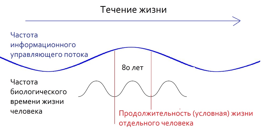 На рисунке ниже изображена разница между частотой биологического времени жизни человека и частотой некоторых информационных управляющих потоков (например, глобальных концепций и идеологий). Рисунок показывает, что человек за всю свою жизнь может на заметить никаких изменений в этих концепциях и не в состоянии даже представить себе, что в жизни всё может быть устроено совсем иначе. Он рождается, живёт и умирает как бы внутри действия определённой концепции, которая, однако, тоже имеет свой жизненный цикл и обязательно проверяется временем на соответствие иерархически высшей концепции мироустройства по замыслу Создателя. Но человек за время своей жизни может не увидеть ни начала действия глобальных концепций, ни их завершения. А потому ему и может казаться, что в мире несправедливость как была всегда и везде, так и останется навечно. Но это не так. Раньше или позже равновесные силы сделают своё дело, а внимательные люди не смогут не заметить перемен в лице времени.