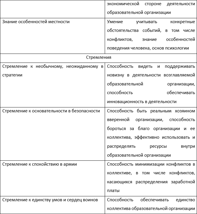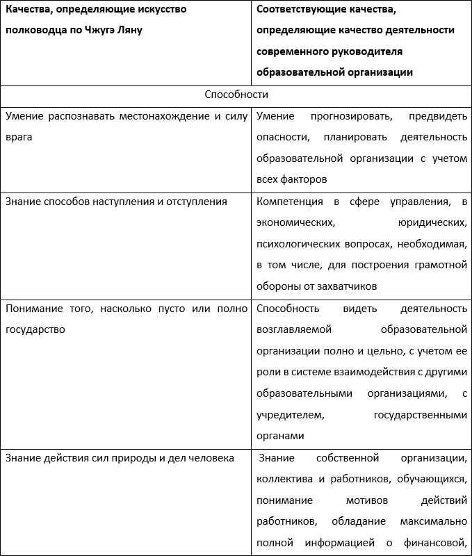 Китайский полководец и государственный деятель древности Чжугэ Лян сформулировал пять способностей и четыре стремления, составляющие искусство полководца[53]. Данные способности и стремления весьма актуальны и для руководителя образовательной организации, ведущего оборонительную войну против захватчиков в приложении к сегодняшней ситуации.