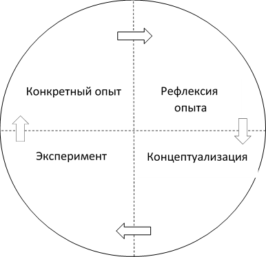 Итак, Дэвид Колб на основании одноименного цикла определил 4 типа обучающихся, т. е. выявил, что люди привыкли по-разному подходить к процессу обучения. Дэвид Колб и его коллеги провели эксперимент на базе Массачусетского технологического института и выяснили, что студенты, которым стратегия обучения непривычна, начинают саботировать обучение. Например, если вся группа стартует строго с фазы конкретного опыта, а часть студентов уже привыкла к тому, что они получают теоретическую информацию до начала каких бы то ни было действий, эти люди „выпадают“ из процесса обучения.