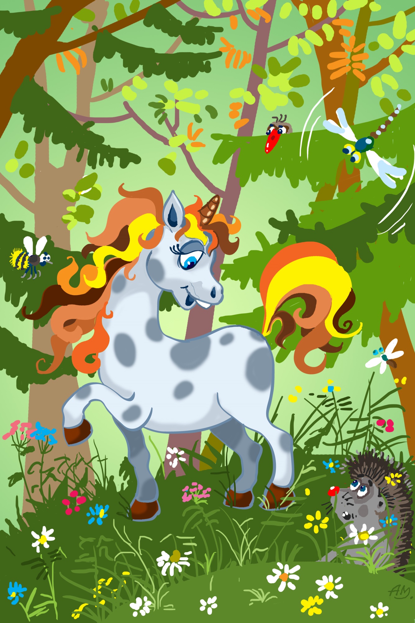Хотя Сашка и поревел с перепуга, но кто ж на его месте удержался бы? А вообще он, как и все единороги, вовсе не похож на трусливого зайца. Сашке даже понравилось сидеть на загривке огромного медведя, когда тот карабкался на указанную сорокой сосну. Лягушек Сашка тоже не испугался и бесстрашно отправился в сказочную страну….