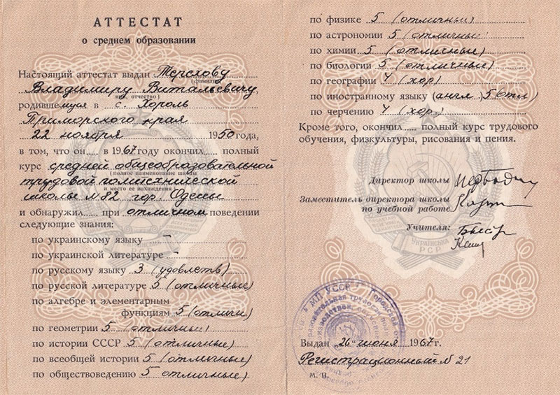 Нет, конечно это не Шевченко. И, наверное, были и среди современных украинских литераторов люди, достойные называться «народными украинскими поэтами и писателями». Но, почему-то, я запомнил только «дыр-дыр-дыр». Наверное, так преподавали. А ещё «украинка» дружила с преподавателем «русского». И вот результат. Как ни боролась Анна Львовна, «трояк» по «русскому языку» в аттестате у меня появился. А по русской литературе «пятерка»! Преподаватель был другой, и на уроках я отвечал, надо полагать, с любовью к предмету. Ну, да, Бог им судья. Вот Анну Львовну жаль, она переживала за меня больше всех, и на выпускном утешала маму, и говорила, что я все равно поступлю, и выучусь. И так, как и я, любили нашу «классную» все без исключения. Даже завзятый двоечник Толя Нечипоренко на выпускном говорил ей слова благодарности за то, что его не выгнали, а вручили «Аттестат». А то, что мы не знали «английский», так тогда задачи такой не было в стране, учить иностранные языки.