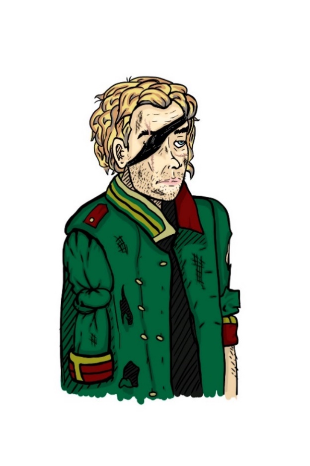 Мужчина, ровесник Жоржа Тимофеевича, немного старше его. Волосы грязные, спутавшиеся, длинные. Лицо худое, заросшее щетиной, нет одного глаза, на его месте повязка в виде чёрной ленты. Одет в рваный военный сюртук, правый рукав завязан в узел, так как руки нет.