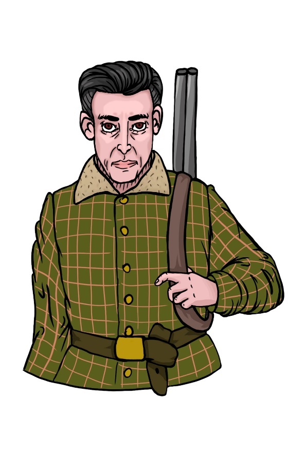 Высокий, сероволосый мужчина с грубыми чертами лица, одет в охотничий костюм, через плечо перекинуто ружьё.