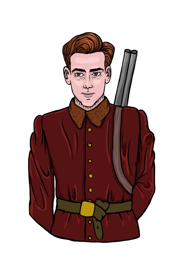 Невысокий юноша шестнадцати лет с рыжими волосами и приятной внешностью. Также как и Антипов одет в охотничий костюм.