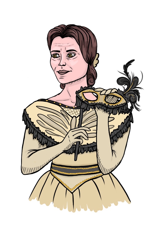 Маргарита Петровна: Девушка лет двадцати пяти. Ухоженная, держится ровно, ходит плавно, движения её всегда точны и продуманны. Выражение лица обычно печальное, спокойное и строгое. Наряд первый, повседневный (первое, второе и вторая половина четвёртого действия): Одета в тёмно-зелёное платье с чёрными вставками, на руках кружевные перчатки, на шее и руках золотые украшения. На лице тёмно-зелёная с золотой окантовкой маска. Наряд второй, бальный (третье и начало четвёртого действия): Нежно-розовое, кремовое платье, обшитое тканевыми цветами, шёлковые перчатки, жемчужные украшения. Маска в цвет платья с тканевыми цветами и блёстками.