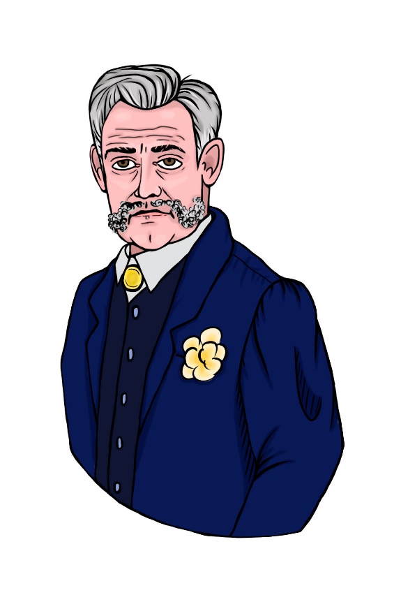 Милый старичок с большими бакенбардами. Он мало говорит. Одет в синий пиджак давно вышедший из моды, к которому приколот небольшой жёлтый цветок.