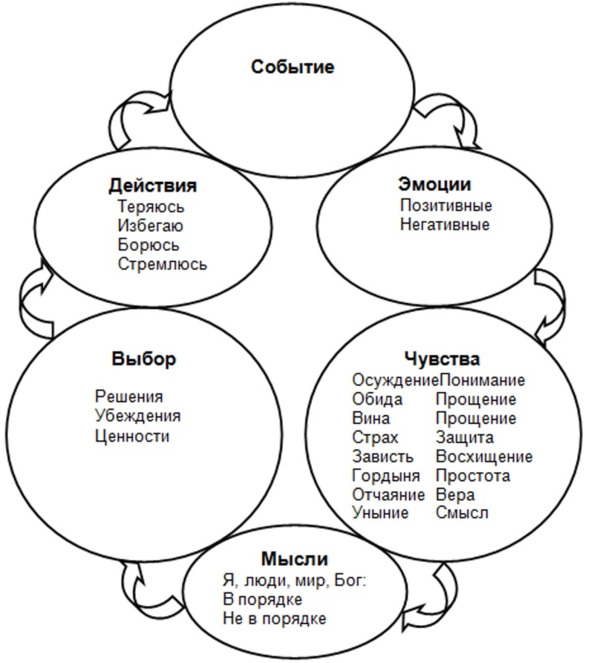 Стресс – кортизол – негативные эмоции – негативные чувства – негативные мысли – негативные выборы и решения – негативные действия – негативное событие – стресс