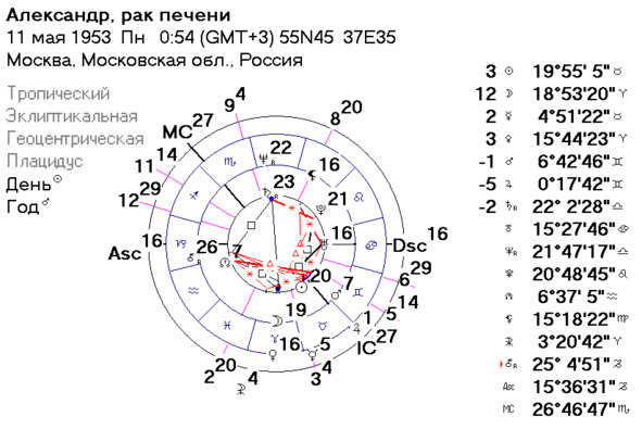 Александр, родился 11 мая 1953 года в 00ч.54м. г. Москва. Умер 5 марта 2018 года от осложнений, вызванных раком печени. Скорее всего, у него был левый большой палец сверху. Александр не являлся моим клиентом. О развитии его болезни и ее исходе достаточно подробно писалось в интернете. Поскольку это, я бы сказала, просто классический случай рака печени, я позволила себе взять его гороскоп для анализа в качестве яркого примера. Время рождения достаточно точное. На своем сайте он писал, что родился от полуночи до часу ночи. Первый брак у него был в 1974 году в Москве. Ректификация по дате и месту регистрации первого брака дала время 00ч.54м. +-2 минуты. Этого вполне достаточно, чтобы составить рабочий гороскоп. Внешность совпадает с гороскопом (Асц в Козероге + включенный знак Водолея): глаза карие, кожа довольно смуглая, волосы темные.