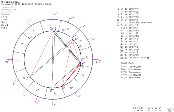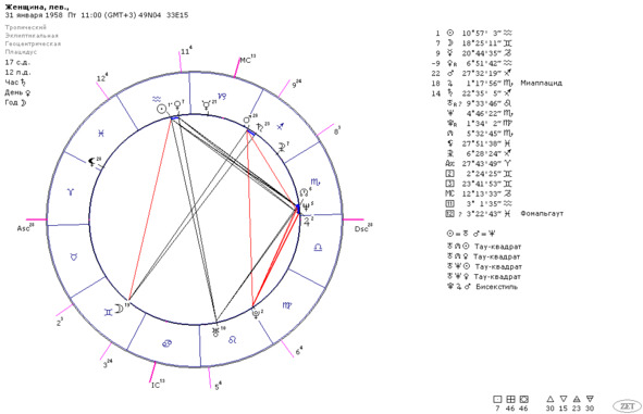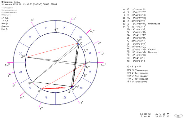 Например, женщина родилась в г. Чусовой Пермского края (58*17`с.ш.). Дата рождения 31января 1958 года. Примерное время рождения – от 13 до 14 часов местного времени, разница с Гринвичем 5 часов. Регистрация 1 брака была 5 октября 1979 года в г. Светловодске (49*04`с.ш.). Поскольку регистрация брака была в городе, находящемся ниже 58гр. с.ш., для ректификации выбираем метод первичных дирекций.
