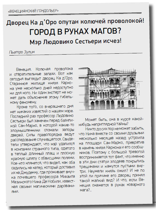 Нина взяла у него газету и с ужасом заметила заголовок на первой странице, набранный крупным шрифтом, а под ним – фотографию дворца Ка д’Оро. Ниже шел текст статьи за подписью известного журналиста Пьетро Зулина.
