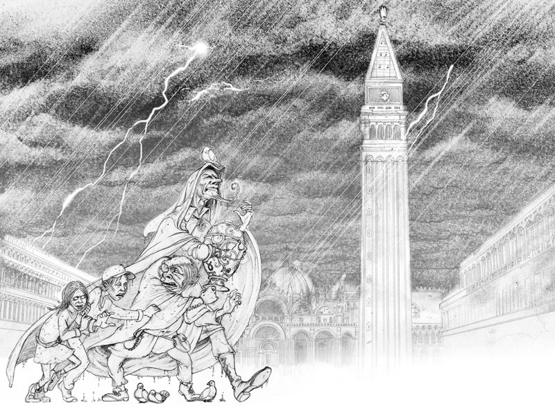 Сентябрьское ночное небо обильно проливалось на город стеной дождя. Он громко лупил по крышам старинных венецианских дворцов, порождая тревожные предчувствия. Плиты площади Сан-Марко, стены колокольни и позолоченные купола огромной базилики блестели от воды. Как и каменные изваяния злотворных врагов Алхимии Света, выставленные перед Дворцом Дожей: четыре статуи и одна отделанная мрамором ваза. Обезвреженные два месяца назад, они символизировали конец дьявольской Магии Тьмы.