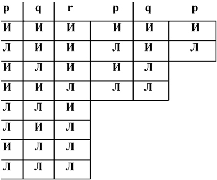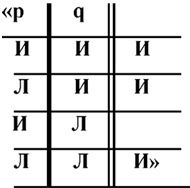 4.31. Мы можем представить возможности истинности схемой следующего вида («И» значит «истинно», «Л» значит «ложно», столбцы знаков «И» и «Л» под строками элементарных суждений символизируют их возможности истинности наглядным образом).