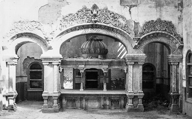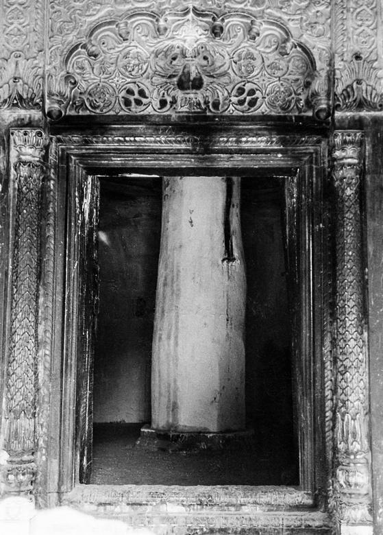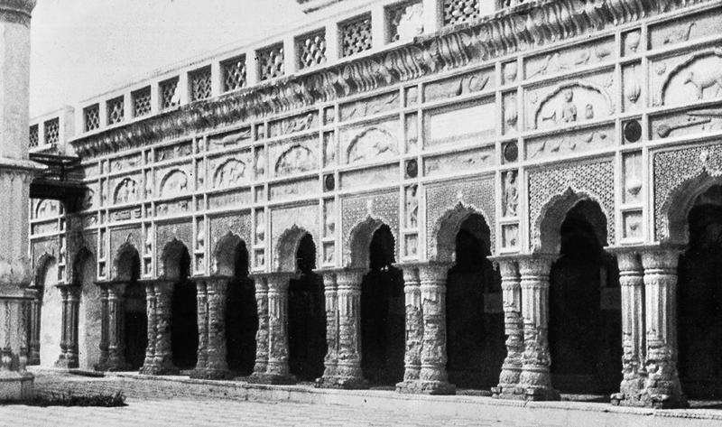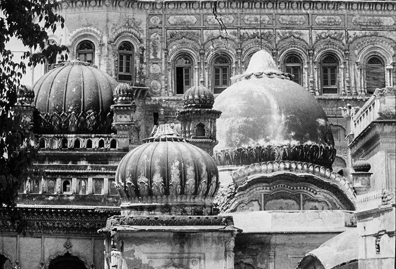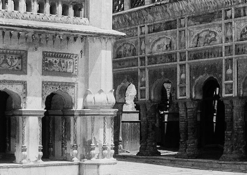 Колонны святилища-самадхи и расположенный рядом с ним Дарбар-холл. На обоих зданиях частично сохранилась искусная резьба и настенная живопись (1982)