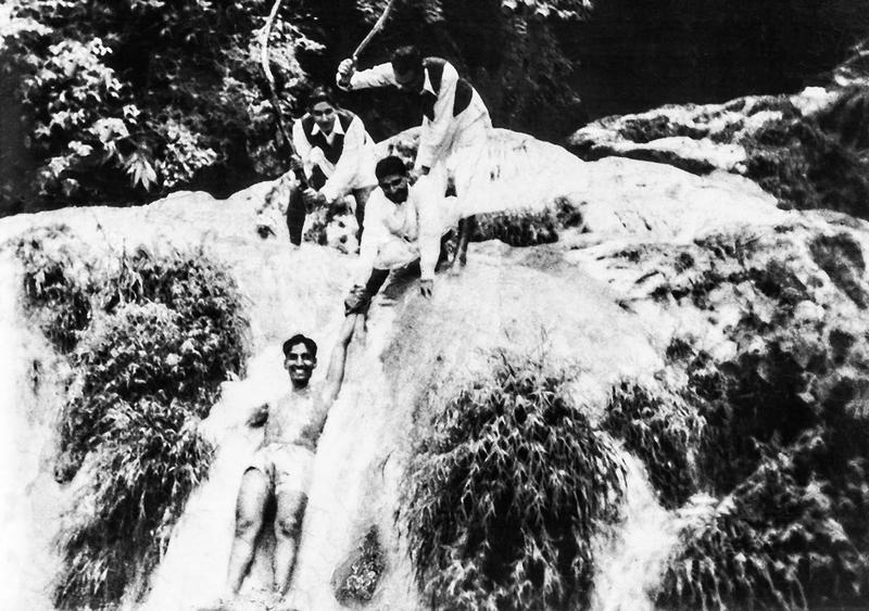 Чандра Пракаш (вверху слева) во время летних каникул развлекается с друзьями на водопаде Кемпти, Массури. Незадолго до разделения страны