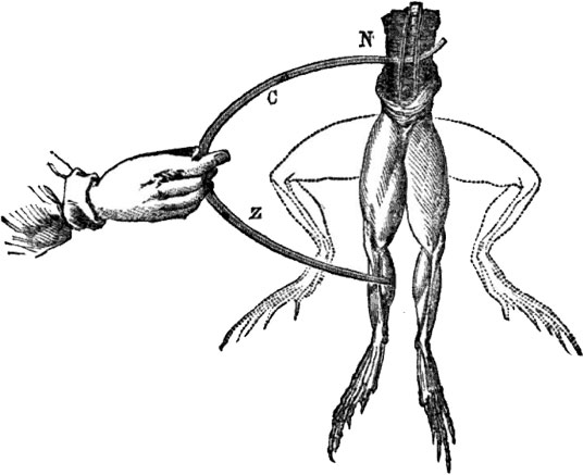 В научном мире хорошо известен казус, который помог ему в этом. При препарировании лягушки ученый случайно оторвал ей лапку (рис. 32), и та, зажатая металлическим пинцетом, попав под действие электрического тока, стала сокращаться (дергаться).