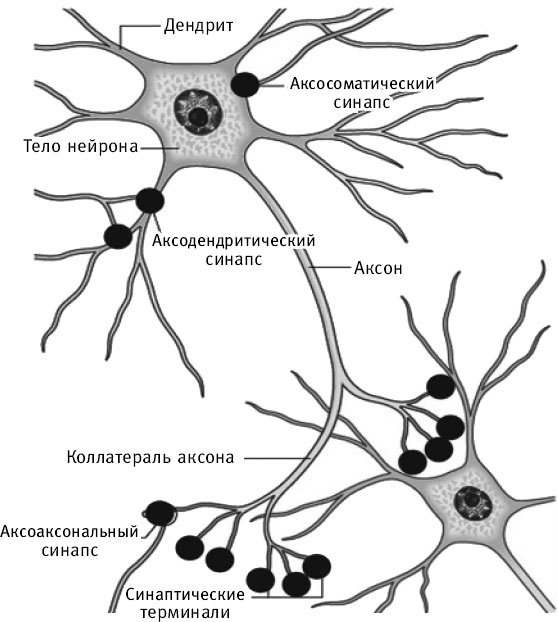 Несмотря на то что нервный импульс имеет электрическую природу, связь между нейронами обеспечивается химическими процессами. Для этого в мозге имеются биохимические субстанции – нейротрансмиттеры и нейромодуляторы. В тот момент, когда электрический сигнал доходит до синапса, высвобождаются соответствующие трансмиттеры. Они, как транспортное средство, доставляют сигнал к другому нейрону. Затем эти нейротрансмиттеры распадаются. Однако на этом процесс передачи нервных импульсов не заканчивается, так как нервные клетки, находящиеся за синапсом, активизируются и возникает постсинаптический потенциал. Он рождает импульс, движущийся к другому синапсу, и описанный выше процесс повторяется тысячи и тысячи раз. Это позволяет воспринимать и обрабатывать колоссальный объем и информации.