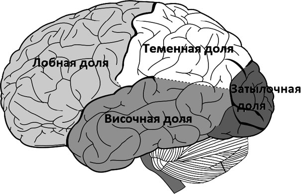 Затылочная, теменная и височная доли имеют соответствующую анализаторную отнесенность. В нейропсихологии ее принято обозначать как модальную специфичность. Благодаря им осуществляются разные психические функции. Вкусовые и обонятельные отделы расположены на медиальной (внутренней) поверхности височной доли. Их роль в осуществлении когнитивных функций у современного человека перестала быть ведущей, то есть уступает по функциональной значимости ролям остальных долей мозга.