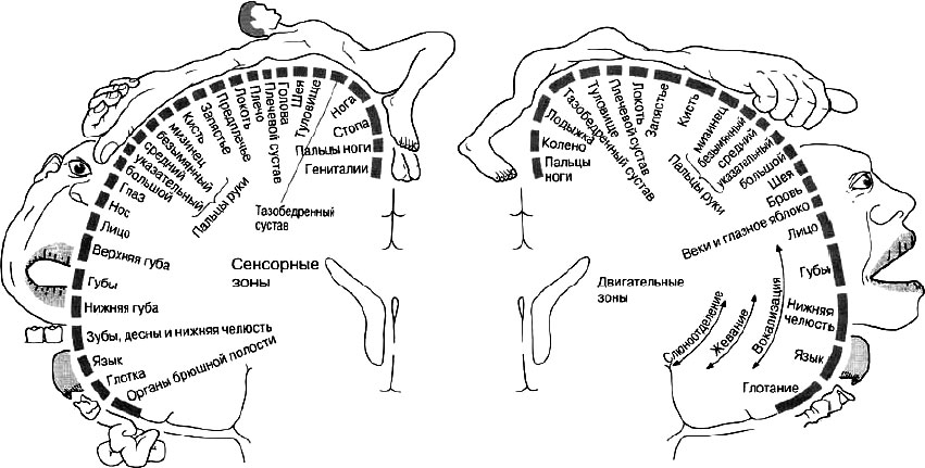 Первичные поля, расположенные на мозговой территории до центральной извилины (переднем блоке мозга), настроены на подготовку и исполнение двигательных актов. Они также являются проекционными, но уже в отношении не чувствительных (кинестетических – сенсорных), а двигательных (моторных) функций. На уникальных рисунках, сделанных известным исследователем работы мозга У. Пенфильдом (W. G. Penfield), видно, что значимость разных частей тела не совпадает с их размерами, а определяется той ролью, которую они играют в осуществлении психических функций как при восприятии объектов внешнего мира, так и при воспроизведении различных действий (рис. 36).
