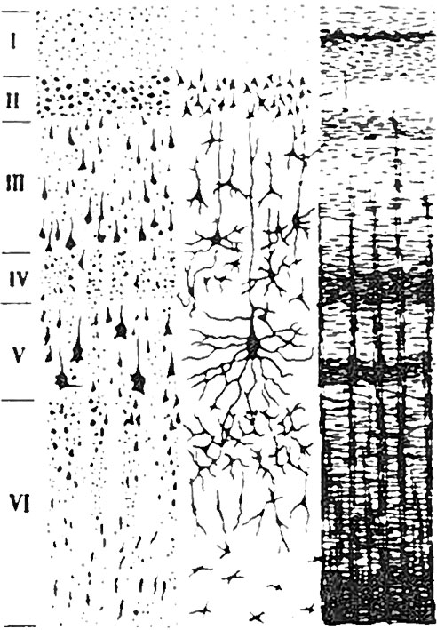 Между слоями коры расположена глия (совокупность вспомогательных клеток нервной ткани), которая выполняет, по существу, роль клея, связывающего многочисленные нейроны коры мозга между собой. Тем самым глия участвует в межзональных связях с когнитивной сутью. Микроскопические размеры отделов, составляющих кору мозга, потребовали изобретения невероятно мощных технических средств для их изучения. В настоящее время исследователи в области нейронаук вооружены приборами, позволяющими увидеть то, о существовании чего не так давно даже не знали. В результате перестало быть тайной, что кора мозга представлена несколькими слоями.