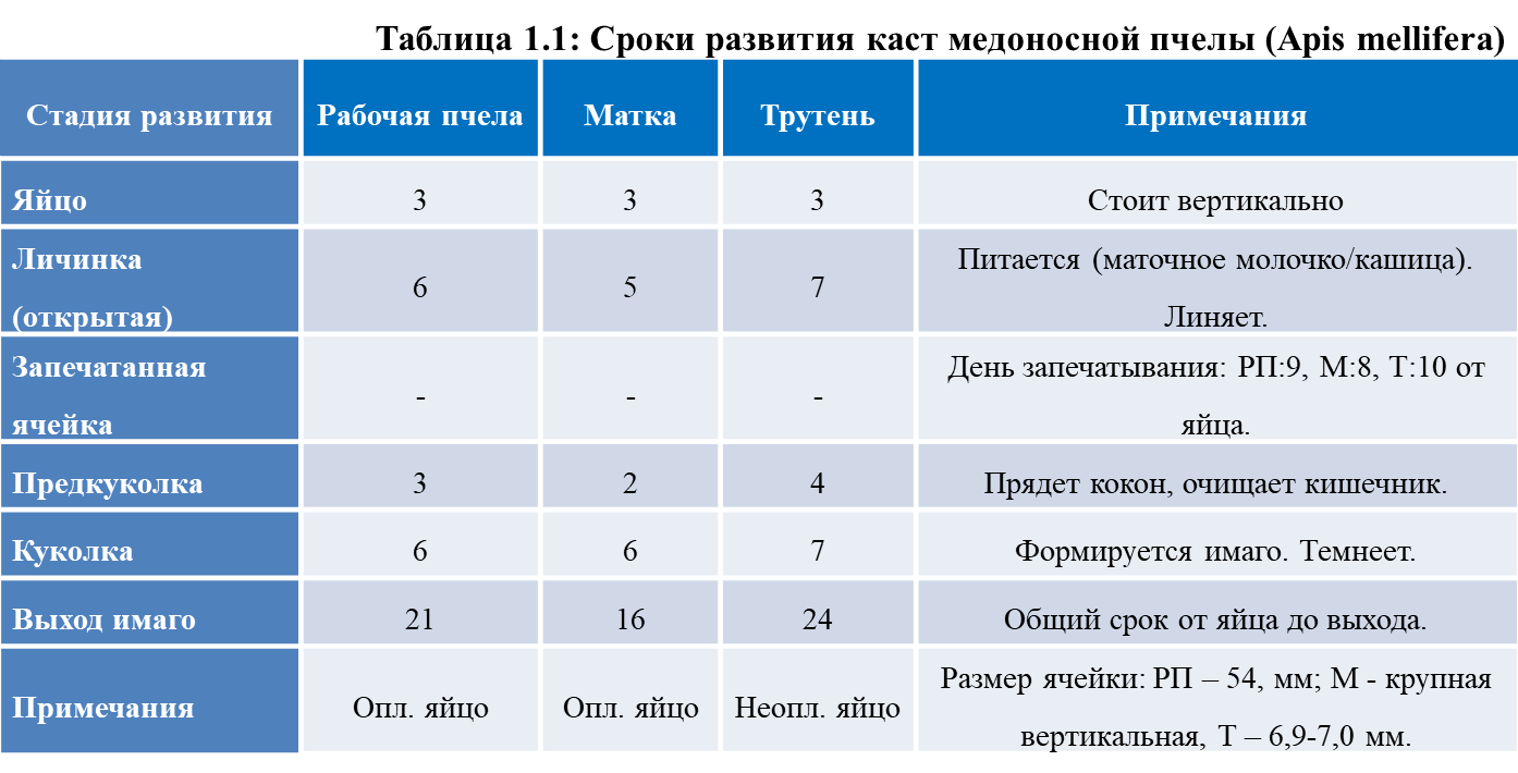 В пчелиной семье существуют три четко выраженные касты (формы особей), выполняющие разные функции. Развитие каждой касты проходит через полное превращение: яйцо -> личинка -> предкуколка -> куколка -> взрослая особь (имаго). Скорость развития и особенности зависят от типа особи и качества питания личинки.