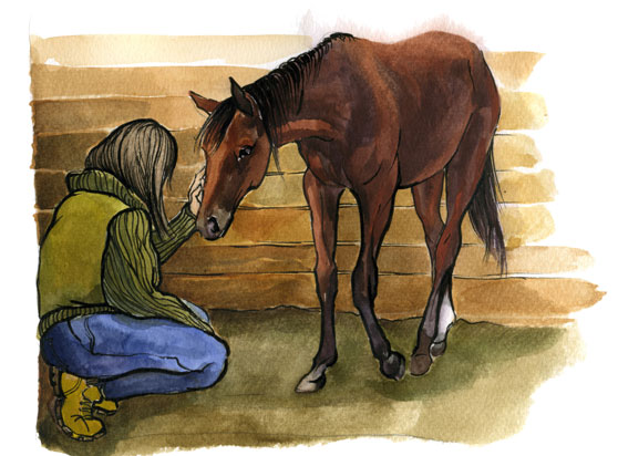 Скрипнула дверь, и в денник вошла Зануда, непохожая на себя, тихая и какая-то беспомощная. Мельком взглянув на жеребёнка, она отошла в угол и уселась там, глядя в пространство перед собой. По её лицу текли слёзы…