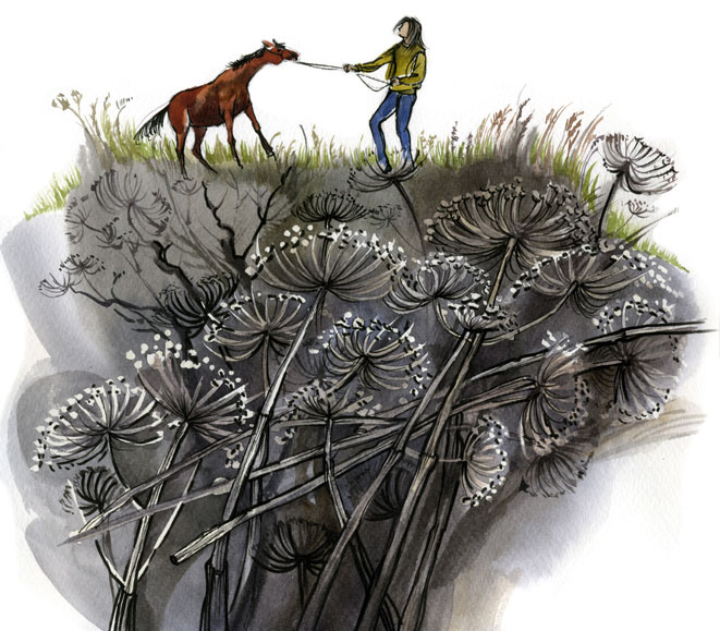 Марику вдруг стало страшно, он присел на задние ноги, задрал голову и натянул верёвку. Ни одна лошадь по своей воле не пошла бы дальше! Ни одно здравомыслящее существо! Кроме, конечно же, человека. Зануда, видимо, хоть и ощущала беспокойство, но не понимала, что причина его скрывается там, внизу. Погоняв Марика вокруг себя, она умудрилась подвести его к самому краю оврага.