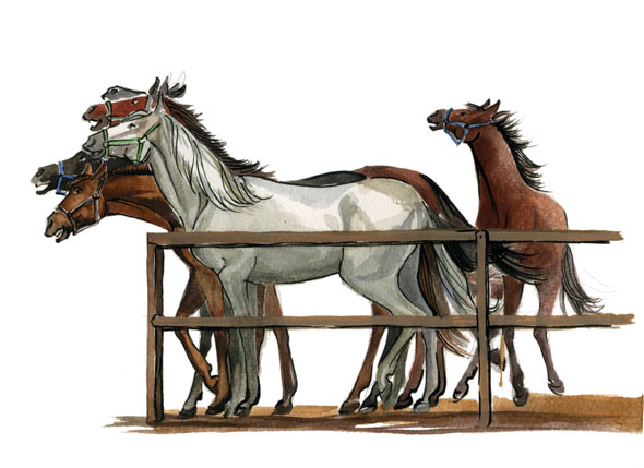 Все взгляды были направлены в сторону ворот, но за спинами лошадей жеребёнку не было видно, что там происходит.