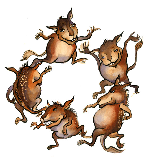 Вглядевшись, Марик с удивлением заметил, что у его ног кружатся в бешеной пляске крохотные существа, стараясь ущипнуть незнакомца за ноги! Тот гарцевал, высоко вскидывая копыта, в тщетной попытке избавиться от них. До Марика донёсся обрывок злорадной песенки:
