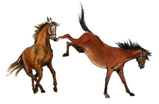 Незнакомый жеребёнок несколько шагов прошёл спокойно, подозрительно поглядывая на Зануду. Но вьюшки не унимались, и он высоко подпрыгнул, махая ногами, безуспешно пытаясь стряхнуть их.