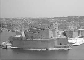Город Биргу на другом берегу залива защищен мощным фортом св. Ангела с двумя рядами стен и бастионов, между которыми проходит защищенная терраса, а внутренняя стена охраняет башни и строения форта, соединенного с городом высоким арочным виадуком. Со стороны суши Биргу защищает двойная стена с куртинами и бастионами, охрана которой была распределена между Кастильским, Оверньским, Французским, Прованским и Арагонским языками ордена, а стена, защищающая полуостров с внешней стороны залива защищалась немцами и англичанами.