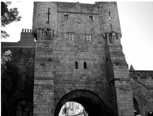 Стать торговым центром Йорку позволило его расположение при слиянии двух рек, Аус и Фосс. Он окружен кольцом белокаменных стен с прямоугольными зубцами, которые соединяют мощные круглые башни. Камни для укрепленных наклонными контрфорсами стен брались строителями из римских укреплений.