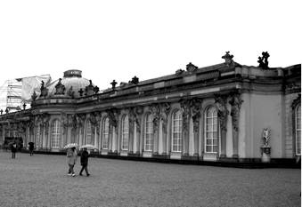 Одноэтажное желтое здание дворца Сан-Суси с овальным куполом с люнетами, окруженным балюстрадой с вазонами – старейшее в дворцовом комплексе – построено при непосредственном участии Фридриха Великого в 1748 г. Это, пожалуй, самый знаменитый и самый красивый дворец в Потсдаме, ставший родоначальником всего дворцового комплекса. Прорезанные большими полукруглыми окнами и декорированные сдвоенными пилястрами с гермами между ними, стены дворца помнят взлеты и падения Бранденбургской династии. Парадный фасад дворца, стоящего на высоком партере, обращен на сад. Противоположный фасад открывается на внутренний двор, который опоясывает полукруг колоннады с 2 рядами колонн. Фридрих Великий так любил это место, что завещал похоронить себя тут, очень скромно, не возводя никаких надгробий. Он считал сам дворцовый комплекс достойным памятником себе, и не ошибся. Его завещание было исполнено, и на газоне у одного из боковых флигелей находится его могила.