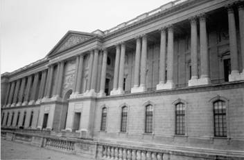 Лувр ведет свою историю с 13 в., когда Филипп Август построил мощную крепость на правом берегу Сены, входившую в городскую систему укреплений. С 1356 г Лувр становится королевским дворцом, а основное строительство современного Лувра начинается в 1546 г., и сейчас его составляют квадратное в плане, с замкнутым внутренним двором крыло Сюлли, обращенное на Сену крыло Денон, и проложенное вдоль улицы Риволи крыло Ришелье. В образованном этими тремя корпусами обширном внутреннем дворе возвышается триумфальная арка Карузель, построенная на одной линии с Триумфальной аркой на площади Звезды, и сад Тюильри, разбитый на месте одноименного дворца, сгоревшего во время революции.