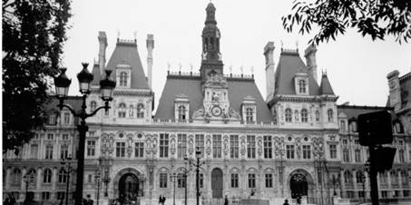 Аристократический квартал Марэ был построен на месте осушенных болот и сохранился после перепланировки Парижа бароном Оссманом, давая представление о городе эпохи Людовика XIII. Здесь в 1882 г. на месте старой, сгоревшей, построена мэрия Парижа, Отель де Виль, великолепное белокаменное здание, полукруглые окна первого этажа которого разделены пилястрами, задающими ритмичную структуру, над ними помещены полуколонны, разделяющие прямоугольные окна второго этажа. Мансардные окна увенчаны треугольными фронтонами, между ними установлены статуи. Здание фланкировано двумя прямоугольными башнями с завершениями в виде усеченной пирамиды, углы которых подчеркивают статуарные ниши. Над небольшим треугольным фронтоном с часами возвышается восьмигранная железная башня с куполом. Окна и фронтон декорированы скульптурой.