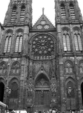Все старинные городские здания построены из местной вулканической породы андезита, которая имеет черный цвет. Благодаря этому город имеет мрачноватую колористику, резко выделяющую его среди других французских городов. Собор построен в центре Клермона, на вершине холма, с которого спускаются узкие извилистые средневековые улочки, застроенные двух-трехэтажными домами. Его начали строить в 12 в. на месте древнего собора, в котором Урбан II читал свою проповедь. Древнейшей частью этого черного готического сооружения является хор с алтарной частью, оставшейся от романского храма, трансепт и неф были достроены в 14 в., а западный фасад был завершен в 19 в. Виоле-ле-Дюком. Он фланкирован двумя симметричными квадратными башнями с каменными шпилями, сжимающими треугольный фронтон, укрывающий большую розетку и стрельчатую арку портала с высоким вимпергом в окружении двух квадратных башенок со статуарными нишами под балдахинами, завершающимися пинаклями. Полукруглая алтарная апсида окружена венцом капелл, в центральной из которых находится деревянная статуя Черной Богоматери 12 в., особо почитавшаяся в Средние века и привлекавшая в город много паломников. Над галереей, окружающей хор, устроены террасы, адаптирующие северную готику к южной местности.