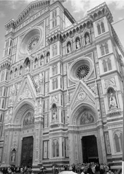 Великолепный романо-готический кафедральный собор, колокольня Джотто и баптистерий, образуя ансамбль из белого, розового и зеленого мрамора, являются самой яркой и впечатляющей архитектурной достопримечательностью города. Кафедральный собор Санта Мария дель Фьоре (Девы Марии с цветком) строился с 1296 г. в стиле флорентийской готики на древнем романском основании. Его начал строить архитектор Арнольфо ди Камбио, и со временем собор стал третьим по величине в мире. Собор явился одним из первых купольных христианских храмов, традиционная базиликальная система видоизменена здесь за счет добавления в восточной части трех пятикупольных выступов, которые должен был перекрыть огромный купол. Его возведение в 15 в. стало последним этапом строительства собора. Эту трудную архитектурную задачу долго не могли решить, пока архитектор Филиппо Брунеллески не построил купол из двух оболочек (внутренней и внешней) в формах, характерных для эпохи Возрождения.