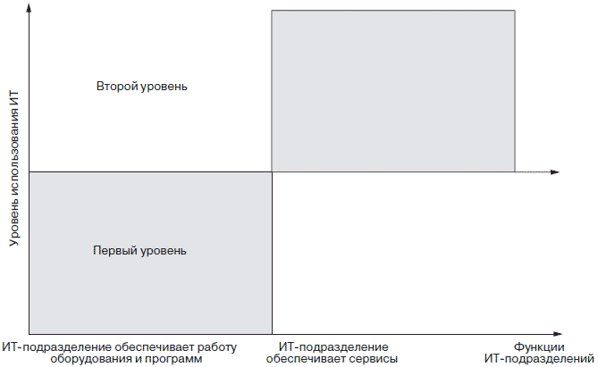 Большинство российских предприятий в настоящее время находится в светлой области графика (белый цвет). Дальнейшее развитие предприятий в области использования информационных технологий подразумевает их переход в заштрихованную область. Под сервисом в данном случае понимается услуга со стороны информационных технологий, предоставляемая бизнес-подразделениям, для решения определенной задачи в рамках бизнес-деятельности предприятия.