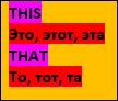 Данную тему желательно начинать на втором уроке, когда сданы хоть какие-то существительные и прилагательные. В тетради ученика красиво пишете слово this, а под ним that, обведите в красивую рамочку желательно цветными фломастерами с переводом: this – этот, эта, это, а that – тот, та, то, объясняя, что у них это понятие буквальное. Если рядом – this – это, чуть подальше – уже that – то. Использование цветов, рамочек и выделений очень важно, так как многие запоминают именно зрительные образы, особенно если они выделены яркими цветами. Ну, допустим, так:
