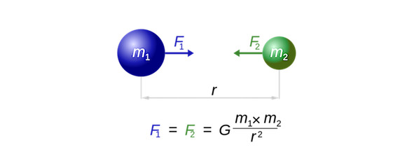 Закон всемирного тяготения гласит, что сила гравитационного притяжения F между двумя нематериальными точками с массами m1 и m2, разделенными расстоянием r, действует вдоль соединяющей их прямой, пропорциональна обеим массам и обратно пропорциональна квадрату расстояния.