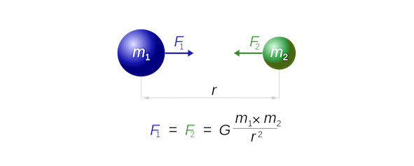 The law of universal gravitation States that the force of gravitational attraction F between two immaterial points with masses m1 and m2 separated by a distance r acts along the line connecting them, is proportional to both masses and inversely proportional to the square of the distance.