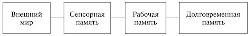 Пo мере того как в психологии росло влияние когнитивного подхода[48], росло и число сторонников представления о том, что существует не один вид памяти, основанный на связи стимул – реакция, а два-три, а возможно, и больше. На рисунке представлена концепция понимания памяти, в основе которой лежит предложенная Аткинсом и Шифриным сенсорная модель[49], которая впоследствии с учетом новейших исследований была уточнена и модернизирована.