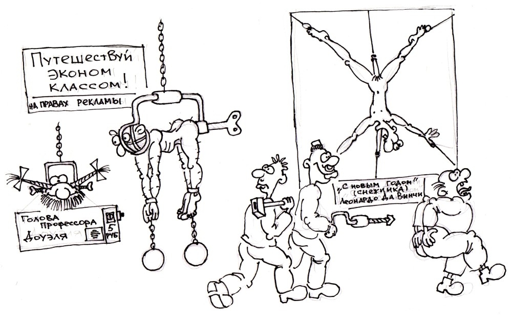 На самом деле в последнее время мы были озадачены проблемой побега. А задумали мы его после того, как я на себе испытали некоторые виды пыток. В частности, я попал под Гиппократову экзекуцию – за оскорбление Цербера и издание, совместно с Гашеком, стенгазеты. Пса я просто обругал сукой, а в стенгазете мы нарисовали демона Дрочио в бикини и с зонтиком, поздравив при этом с восьмым мартом.