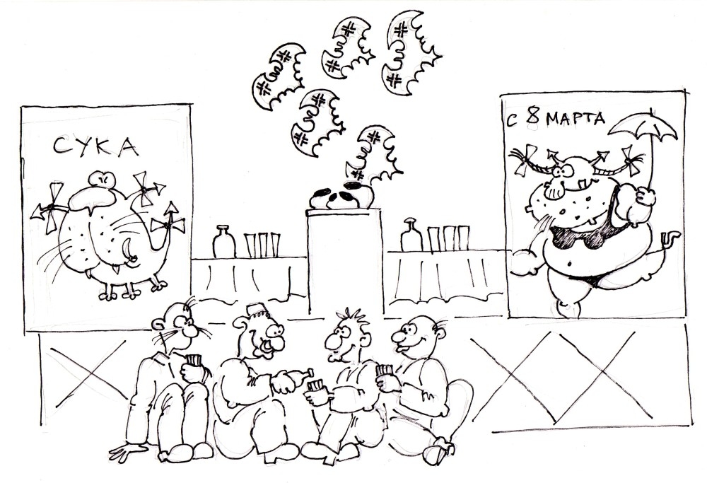 Здесь «горько» не кричали. Здесь жрали и пили. Но питье было особое. Наливая из одной бутылки, кто-то получал щербет, а кто-то «боржоми» (12-я скважина). Видать, волшебство такое и, одновременно, кидалово. Закусь была одинакова для всех. Тем позорней было пить минералку. То и дело возникал ропот и недовольство. Грешники менялись стаканами, но хуй там – кому бухло, кому водичка. На всю эту призрачную трапезу смотреть было не особо приятно.