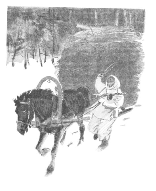 Он хлестнул лошадь и, схватив в руки вожжи, побежал рядом с возом, бойко тронувшимся с горы. И, обернувшись, еще успел улыбнуться финну. Автомат у него висел на груди, а лыжи он воткнул в сено, из которого торчал наружу запальный шнур, похожий на поросячий хвост.