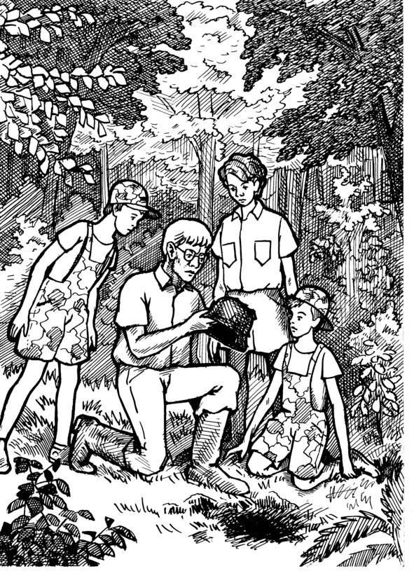Павлик срезал небольшую веточку, очистил её от листьев и стал осторожно отбрасывать от находки кусочки мха и комочки земли. Вскоре послышались шаги и голоса спешащих к ним ребят. Первым, естественно, появился Петя, запыхавшийся от быстрого бега, следом за ним вокруг находки собрались остальные.