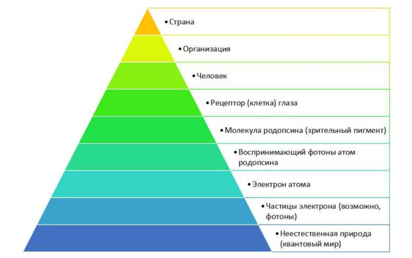 Взаимодействие происходит на всех уровнях распознавания одномоментно. Страна взаимодействует со страной. Это значит, что определённые структуры, например, министерства иностранных дел этих стран или администрации президентов взаимодействуют друг с другом и распознают друг друга. А это значит, что уполномоченные чиновники с каждой стороны взаимодействуют друг с другом, распознают друг друга. Это в свою очередь значит, что их органы чувств – глаза, уши – распознают сигналы, которые они могут воспринимать. Следовательно, клетки сетчатки глаз – палочки и колбочки – распознают сигналы взаимодействия, что приводит к тому, что чувствительный к свету пигмент родопсин изменяет свою форму под активностью потока света, отражённого от молекул тела другого человека, чтобы изменить ток ионов и дать сигнал измениться активности палочки или колбочки. А это значит, что активные атомы молекулы родопсина изменяют свою активность при попадании в них фотона. И субатомные структуры реагируют на влияния, на которые они могут реагировать при влиянии рангоподобных фрагментов ещё более мелких систем. И в итоге распознавание происходит по всему конусу распознавания вложенных друг в друга систем как вверх, так и вниз, до квантового уровня и дальше в неестественную среду (рисунок 5).