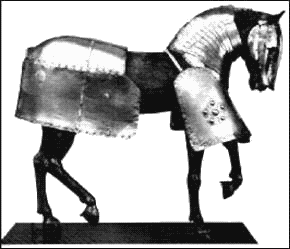 Рыцарская лошадь также была защищена доспехом, зачастую не только стеганым, но и металлическим. Но вообще-то во время рыцарского поединка наносить удары по лошади противника, а не по самому противнику, считалось делом бесчестным. Тем более что обученные рыцарские кони, способные долгое время носить тяжеловооруженного рыцаря, были очень дороги. Такого коня каждый рыцарь стремился взять живым в качестве трофея.