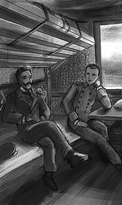 Шестое чувство подсказывало Горскому, что незнакомец сейчас войдет в его купе. Так оно и вышло. Перед Антоном Федоровичем возник невысокий субтильный офицер флота с пышными венгерскими усами и элегантными саквояжами в каждой руке. Брюнет в серой нестроевой шинели-пелерине и черной фуражке приветливо поздоровался: